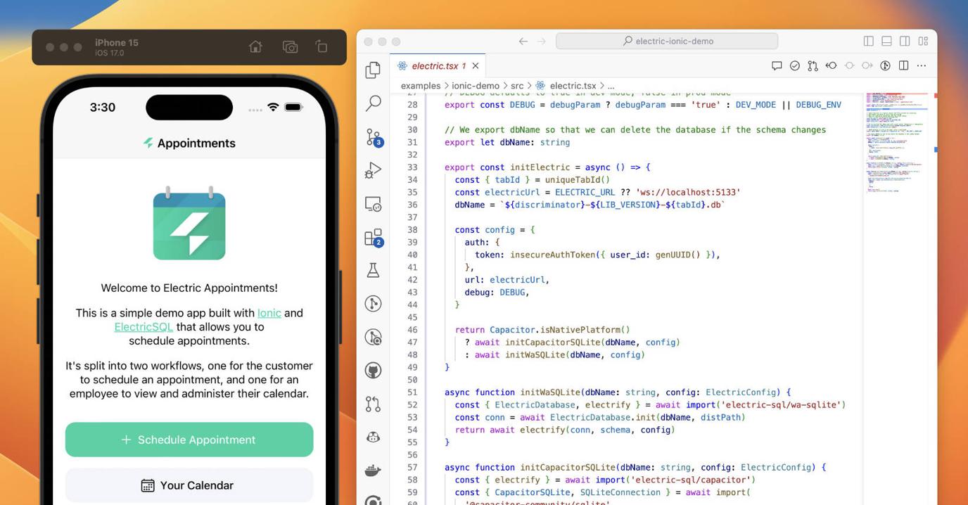 The pairing of ElectricSQL with the Ionic Framework and Capacitor is a compelling route for rapid application development. It results in a single codebase for web, iOS and Android apps, along with full offline and collaborative real-time support.